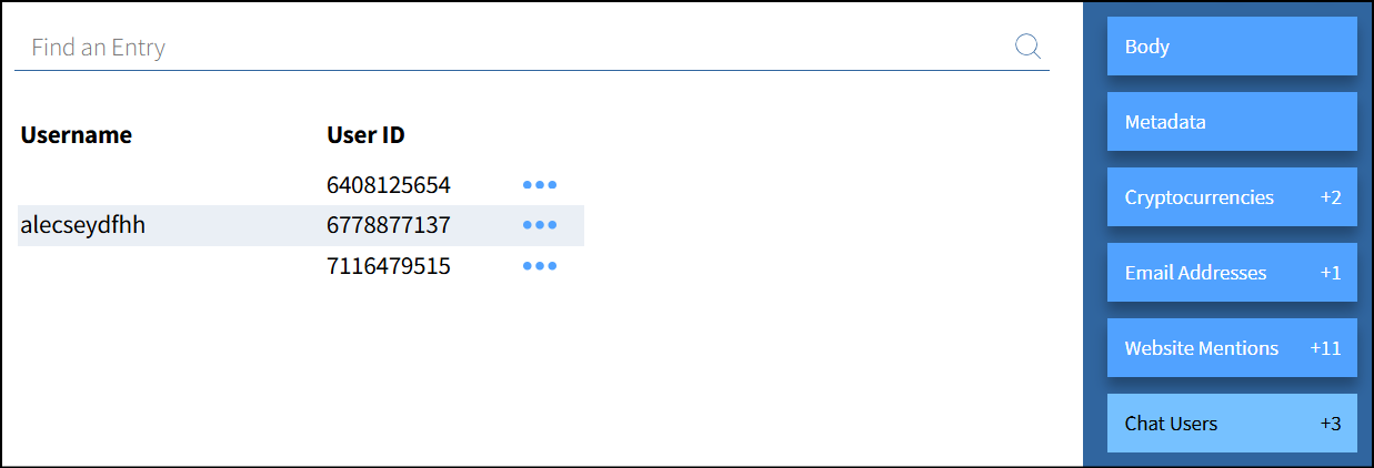 Tokenized features we mine out of the body of the result, which are currently Entities (emails, credit cards, cryptocurrencies, cves, ip addresses, ssns, website mentions) and Chat-related information (users, user IDs, servers, channels, channel IDs). Entities and Chat Users appear as individual View Switches in Search Results, if present in the body. |