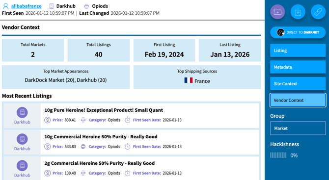 Vendor Context is based on analysis of DarkOwl's enhanced market dataset within its DarkMart data store. It includes the following information: