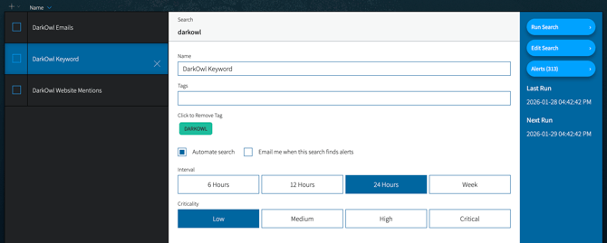 On the right panel, you can take actions to Run Search or Edit Search (the search query itself). Both of these actions will route you to the Research section. If Automate search is selected, you will have additional options: