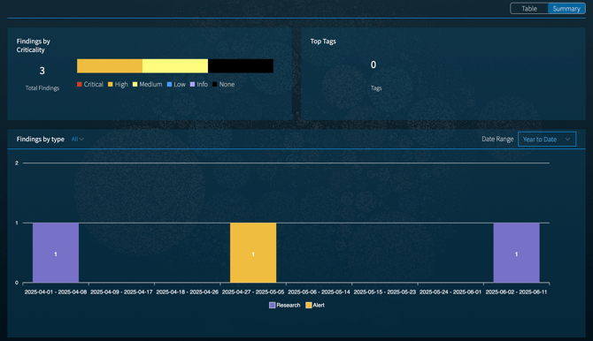 • A toggle switch to see Findings in Table view or Summary view. Table view is the default.
