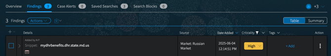 The Findings tab will display all of the results saved into the case. The top of the result set will include the total number of Findings, as well as: