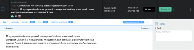 • Source metadata from where the result was collected, which can include source type, site/leak/channel names, URL, leak filepath and filename, or channel ID